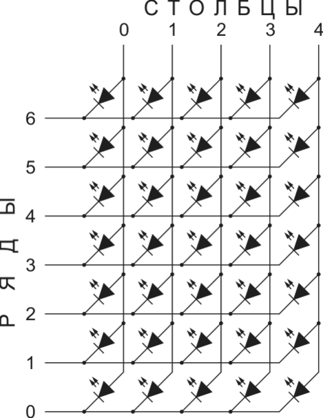 В матричном индикаторе элементы индикации сгруппированы по строкам и столбцам.