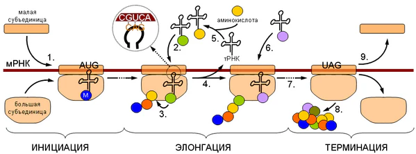 - Вышеописанные три последних процесса продолжаются, пока рибосома не встретит стоп-кодон.