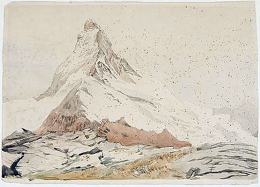 Одними из первых изображений Маттерхорна, получившими широкую известность, стали работы английского художника Джона Рёскина «Маттерхорн» («The Matterhorn», 1849 год, карандаш, акварель[96]), опубликованные им в сборнике «Современные художники» (Modern Painters) в 1856 году. Работы Рёскина произвели сильное впечатление на образованную элиту Англии и повысили интерес к вершине. Хотя Рёскин ни разу не предпринимал попыток взойти на Маттерхорн, он сумел очень точно отразить все особенности вершины, изучая её с разных сторон. Эдуард Уимпер, рассматривая картины Рёскина, отметил, что на рисунках присутствуют многие детали поверхности, которые обычный художник-график отбросил бы. По его словам, только человек, который соприкасался с вершиной и пытался на неё подняться, смог бы так точно всё передать[33].