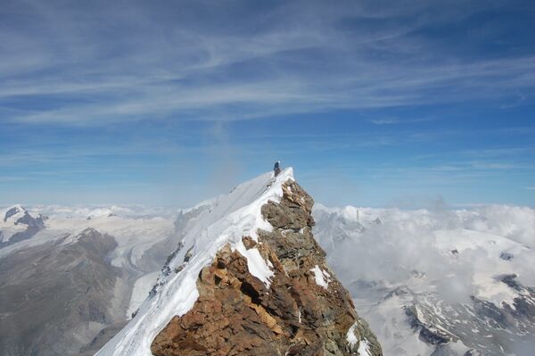 Чем выше мы поднимались, тем сильней становилось волнение. А если нас обойдут в самый последний момент? Уклон стал меньше, и, наконец-то, мы смогли отвязаться. Вместе с Кро мы припустили на вершину в гонке, которая закончилась вничью. В 1:40 пополудни мир был у наших ног, и Маттерхорн был взят. Ура! Ни одного отпечатка следов не было видно.[60]