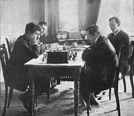 1. e4 e5 2. Кf3 Кc6 3. Сb5 Кf6 4. O-O d6 5. d4 Сd7 6. Кc3 Сe7 7. Лe1 ed 8. К:d4 O-O 9. К:c6 С:c6 10. С:c6 bc 11. Кe2 Фd7 12. Кg3 Лfe8 13. b3 Лad8 14. Сb2 Кg4 (этот странный отскок коня, выглядящий как грубый тактический просмотр, часто комментируется в шахматной литературе как пример психологического подхода Ласкера) 15. С:g7 К:f2 16. Кр:f2 Кр:g7 17. Кf5+ Крh8 18. Фd4+ f6 19. Ф:a7 Сf8 20. Фd4 Лe5 21. Лad1 Лde8 22. Фc3 Фf7 23. Кg3 Сh6 24. Фf3 d5 25. ed Сe3+ 26. Крf1 cd 27. Лd3 Фe6 28. Лe2 f5 29. Лd1 f4 30. Кh1 d4 31. Кf2 Фa6 32. Кd3 Лg5 33. Лa1 Фh6 34. Крe1 Ф:h2 35. Крd1 Фg1+ 36. Кe1 Лge5 37. Фc6 Л5e6 38. Ф:c7 Л8e7 39. Фd8+ Крg7 40. a4 (см. диаграмму)