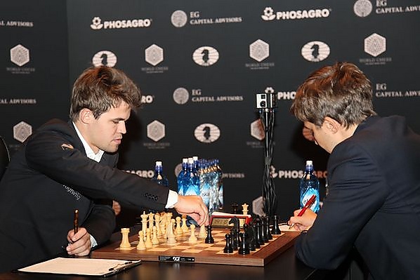 Магнус Карлсен, пожертвовав пешку, организовал прорыв в центре и получил опасную проходную на e2. Однако у белых нашлось достаточно ресурсов для поддержания равновесия, и на 34-м ходу была зафиксирована ничья вечным шахом[73].