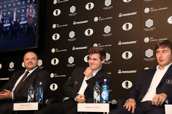 Предматчевая пресс-конференция состоялась 10 ноября. Президент ФИДЕ Кирсан Илюмжинов не смог на ней присутствовать из-за санкций со стороны правительства США по поводу его связей с сирийским режимом, но общался посредством Skype с вице-президентом Израилом Гельфером, официальным представителем ФИДЕ (а не заместителем президента Георгиосом Макропулосом). Присутствовал генеральный директор Agon Илья Мерензон, а два основных спонсора (EG Capital Advisors и «Фосагро») имели представителей, причём обоих игроков и главного арбитра окружали участники[17].