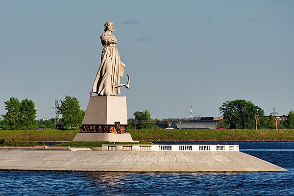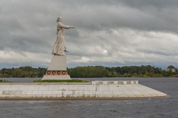 Монумент представляет собой стоящую на постаменте величественную статую женщины в простом платье, с тугими косами, с открытым русским лицом и решительным рисунком губ, которая вглядывается вдаль и олицетворяет собой великую русскую реку и трудовой подвиг строителей гидроузла. Одна рука женщины направлена в сторону Рыбинского моря, приветствуя проходящие мимо корабли, а другая рука сжимает свиток чертежей с планом ГОЭЛРО, её взгляд устремлён вдаль[4][6][9]. Внизу располагается парящий буревестник[9][10]. По периметру постамента проходит скульптурный пояс из круглых литых барельефов[9].