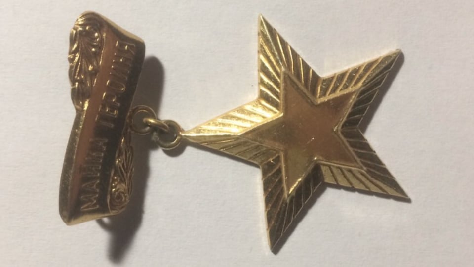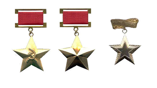 Медаль имеет форму рельефной пятиконечной звезды и изготовлена из золота.
