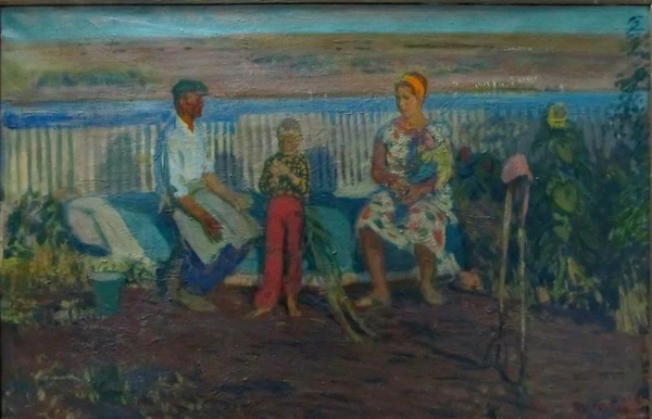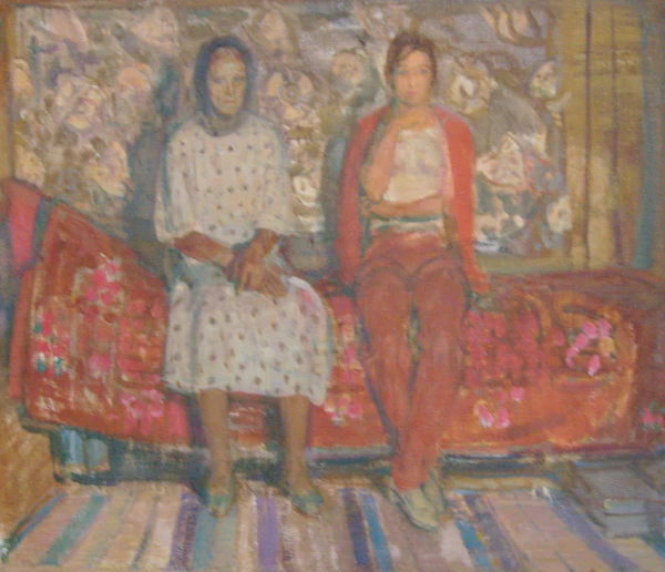 На переднем плане полотна изображены две женщины: слева — пожилая, справа — молодая. Они сидят на кровати, расположенной на фоне яркого ковра, под ногами протянута тканая дорожка. Мать одета в белое платье в горошек и платок, дочь — в спортивный красный костюм без головного убора. Сцена разворачивается в домашнем интерьере, характерном для произведений бытового жанра.