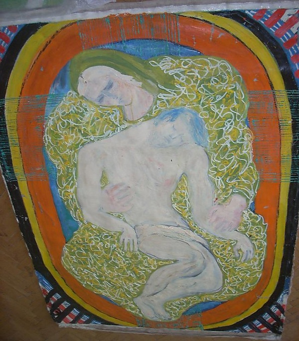 Композиция построена на квадратном холсте с использованием тройного овала — чёрного, жёлтого и оранжевого цветов, размещённых вертикально. В центре овала на синем фоне изображена фигура матери в зелёно-бело-жёлтом одеянии, поддерживающей обнажённую мужскую фигуру в белой набедренной повязке. Углы полотна заполнены яркими штрихами: верхние — красными, нижние — чёрными. По четырём сторонам овала обозначены контуры деревянного креста. Работа выполнена в абстрактной манере, характерной для абстракционизма, с акцентом на цвет и форму в композиции.