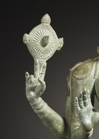 Вишну не был бы Вишну, — неповторимым, чудесным и загадочным, — если бы не раскрывал свою природу непостижимым образом. Поэт Наммальвар, посвятивший Вишну тысячу стихов в поэме «Тируваймоли», о нём пел: «раковину и чакру наш Господь держит в своих прекрасных руках (всегда), невзирая на то, где и в какой форме он спускается (на Землю)» («Тируваймоли», стих 1.8.9). Одними руками он защищает и благословляет, а другими держит священные раковину и чакру. «Его раковина подобна яркой Луне, а его чакра — ослепительному Солнцу» («Тируваймоли», стих 2.7.5). Однако их видят далеко не все — лишь любящие души «видят» две другие. Ведь одна из них держит время любви, а вторая — пространство любви. Любящие объятия рук Вишну — одна из глубоких традиций шри-вайшнавизма. Парашара Бхаттар, двоюродный брат Рамануджи, в комментариях к поэзии Наммальвара объяснял, что чакра, колесо времени, — ничто иное как вечность, а раковина, чей звук разносится по пространству, — бесконечность. Обняв руками, Вишну открывает бессмертное время любви и погружает душу в бездонные глубины любви[5].