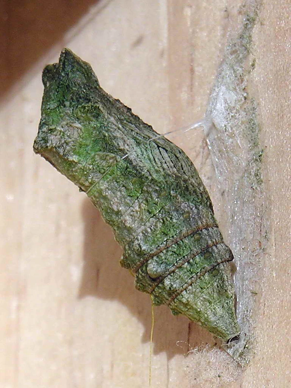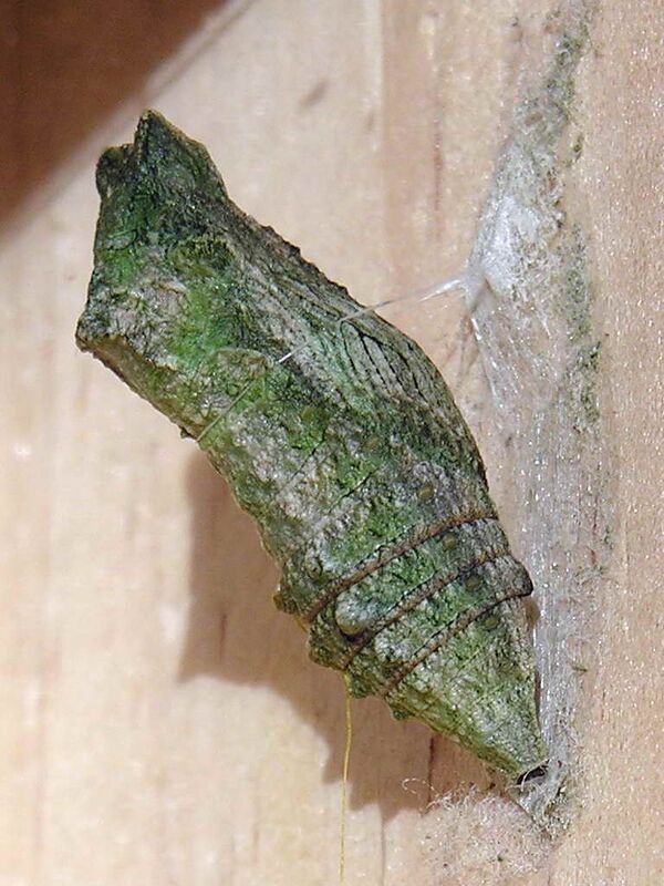 Куколка. Окукливание происходит на стеблях кормового растения либо на соседних растениях. Цвет куколки зависит от цвета субстрата — летние куколки зелёного или желтоватого цвета, покрытые мелкими чёрными точками. Зимующие куколки — бурой окраски, с чёрным головным концом и толстыми рожками на голове. В Центральной Европе стадия летней куколки продолжается 2—3 недели, у зимующих куколок — несколько месяцев[7].