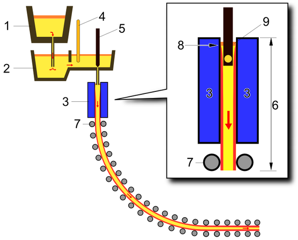 После открытия шибера ковша 1 жидкий металл начинает поступать в промежуточный ковш 2. Промежуточный ковш является своего рода буфером между сталеразливочным ковшом и кристаллизатором 3. Уровень металла перед стопором разливки регулируется заслонкой 4. После открытия стопора 5 (стопорный механизм позволяет плавно регулировать поток металла в кристаллизатор, поддерживая в нём постоянный уровень) из промежуточного ковша металл поступает в кристаллизатор. Кристаллизатор представляет собой водоохлаждаемую конструкцию, которая при помощи сервоклапана совершает вертикальные колебания, для предотвращения застывания металла на стенках кристаллизатора и предотвращения образования трещин[27].