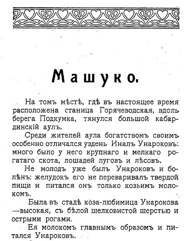 Начало повествования в книге «Кабардинские легенды» русского собирателя фольклора Евгения Баранова издания 1911 года[3]: