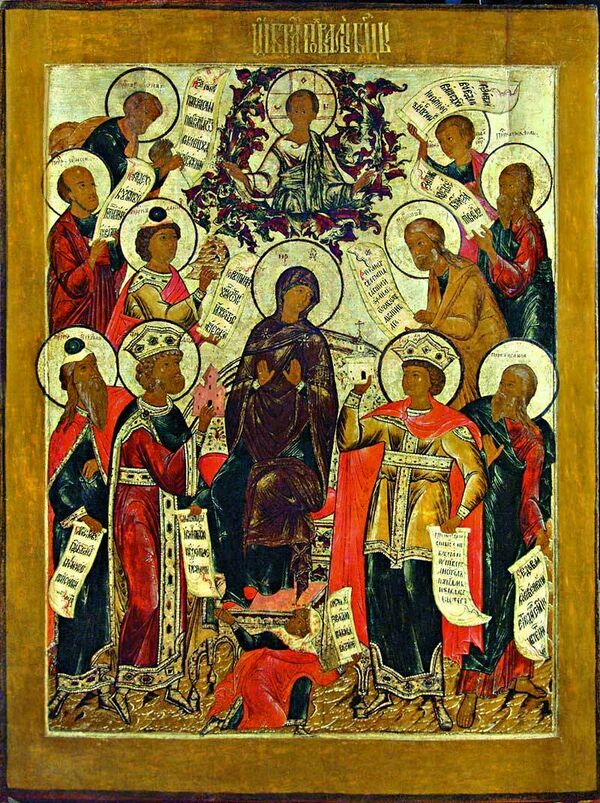 Прототипами «Маэста» были два византийских первоисточника: разновидность изображения Богоматери, которая известна в России как «Похвала Богородицы», и «Богоматерь Одигитрия». «Богоматерь Одигитрия» (греч. — «путеводительница») изображалась по пояс и с младенцем на руках, но иногда сидящей на троне. В основе иконографии «Похвалы Богородицы» лежит песнь из канона пророкам, написанного в VIII веке патриархом Германом Константинопольским «Свыше пророцы тя предвозвестиша», что нашло отражение в православных иконах «Похвалы Богородицы», где она изображается небесной царицей на троне в окружении пророков. С этой иконой связан праздник «Акафистная Суббота», который установился в Византии несколько позднее. Он посвящался Богоматери как защитнице Константинополя от нашествий врагов.