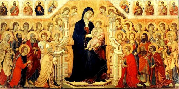 В отличие от первых икон середины XIII века, на которых Мадонну изображали сидящей на троне с Младенцем на руках, а Её царственный статус обозначался только знаками в виде царских орлов на мафории или короны на голове, изображения Мадонны стали в дальнейшем окружать святыми и ангелами. Такой Мадонна предстаёт в образе «Маэста» работы Дуччо ди Буонинсенья, где Её свита, если считать средний и верхний регистры алтарной картины, достигает сорока персон. Тип изображения «Маэста» был особенно популярен в Италии в XIII и XIV веках, поэтому большинство ведущих художников Умбрии и Тосканы писали образы «Маэста» с большим количеством предстоящих фигур ктиторов и донаторов по желанию могущественных заказчиков.