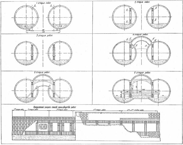 При строительстве станции сначала были пройдены боковые тоннели. Сооружение среднего свода осуществлялось при помощи проходческого щита незамкнутого контура. Полущит монтировался в торце станции и перемещался по роликам, уложенным в боковых тоннелях[24][25]. Конструкции среднего свода жёстко соединялись с тюбингами крайних тоннелей при помощи продольных металлических балок, которые опираются на колонны[1]. Боковые станционные тюбы имеют диаметр 9,5 метра и располагаются на расстоянии 13,5 метра друг от друга[1].
