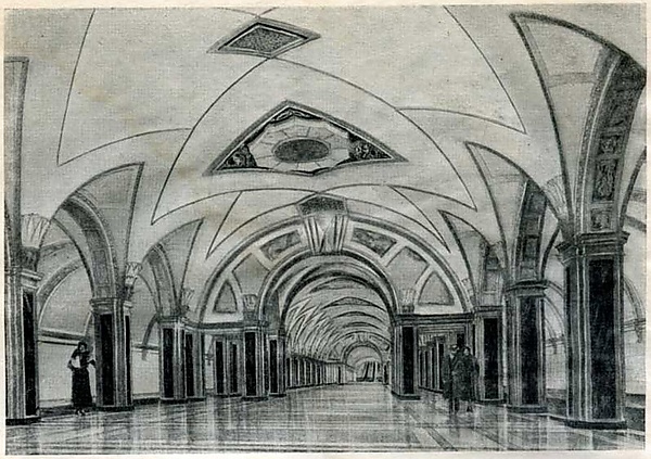 Проект Горьковского радиуса метро, предполагающий строительство станции под Триумфальной площадью, появился в первой половине 1930-х годов[3]. В генеральном плане 1935 года этот проект был утверждён. Автор проекта станции архитектор С. М. Кравец, инженер Н. И. Ушаков и конструктор Р. А. Шейнфайн в качестве эксперимента решили построить колонную станцию глубокого заложения с продольными аркадами. Оформить станцию предполагалось в духе итальянского Ренессанса[4][5]. Однако этот проект был отклонён как неудачный, так как не использовал конструктивные возможности стальных колонн, применение которых было запланировано изначально[5][6]. К работе над станцией подключился архитектор А. Н. Душкин, который существенно изменил первоначальный проект. На заводе «Дирижаблестрой» в Долгопрудном для отделки станции были изготовлены ленты из нержавеющей стали[7]. Ниши свода центрального зала украсили мозаичные панно, выполненные по эскизам художника А. А. Дейнеки. «Маяковская» стала первой станцией глубокого заложения, где была использована стальная колонная система[6].