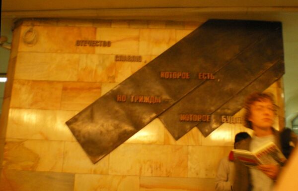 Высота букв составляет 80 мм, ширина 20 мм; со временем надпись существенно пострадала от вандализма, часть букв пришла в негодность. Метрополитен в 2012 году проводил работы по их замене, кроме «Маяковской», будут отреставрированы надписи на 12 станциях, общая стоимость работ составила около 300 тысяч рублей[1].