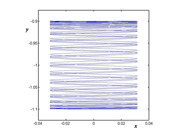 Интересные фазовые портреты могут быть получены для значений параметров, недоступных для аналитического рассмотрения, например в случае большой амплитуды колебания подвеса [6][7]. Если увеличить амплитуду вынуждающих колебаний до половины длины маятника , то получится картина аналогичная той, которая изображена на рисунке.