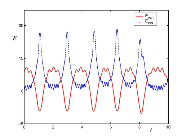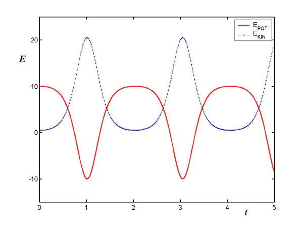 Для математического маятника полная энергия является сохраняющейся величиной, поэтому кинетическая энергия и потенциальная энергия на графике их зависимости от времени симметричны относительно горизонтальной прямой. Из теоремы вириала следует, что средняя кинетическая и потенциальная энергии в гармоническом осцилляторе равны. Поэтому горизонтальная прямая, относительно которой имеется симметрия и , соответствует половине полной энергии.
