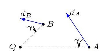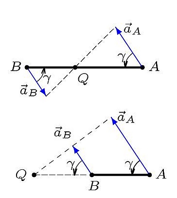 Для того, чтобы определить положение мгновенного центра ускорений, необходимо к векторам ускорений двух различных точек тела провести прямые под равными углами . Если угловое ускорение положительное, то угол откладывается от вектора ускорения против часовой стрелки, иначе — по часовой стрелке. В точке пересечения проведённых прямых и будет находиться мгновенный центр ускорений. Угол должен удовлетворять равенству: