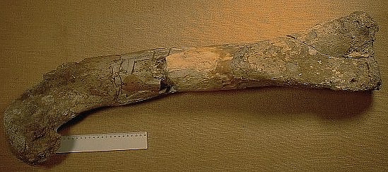 Часть бедренной кости мегалозавра была обнаружена в 1677 году в известняковой каменоломне возле Оксфорда (Великобритания). Окаменелость была передана профессору оксфордского университета Роберту Плоту (англ. Robert Plot; 1640—1696 год), который внёс её описание в свою книгу «Естественная история Оксфордшира» (1677 год). Он правильно опознал бедренную кость, однако, учитывая её огромный размер, не мог определиться с видом животного, которому принадлежали остатки. Позже кость стала причиной казуса. В 1763 году она попала в руки Ричарда Брукса, назвавшего животное Scrotum humanum (лат. scrotum — «мошонка», humanum — «человеческая, принадлежащая человеку»), поскольку кость напоминала окаменевшую человеческую мошонку. В то время уже была создана биноминальная номенклатура, и данное название, теоретически, имеет приоритет перед Megalosaurus, однако оно было забыто более чем на 50 лет и потеряло свой приоритет[8]. Поэтому первый открытый динозавр не стал называться Scrotum sp.