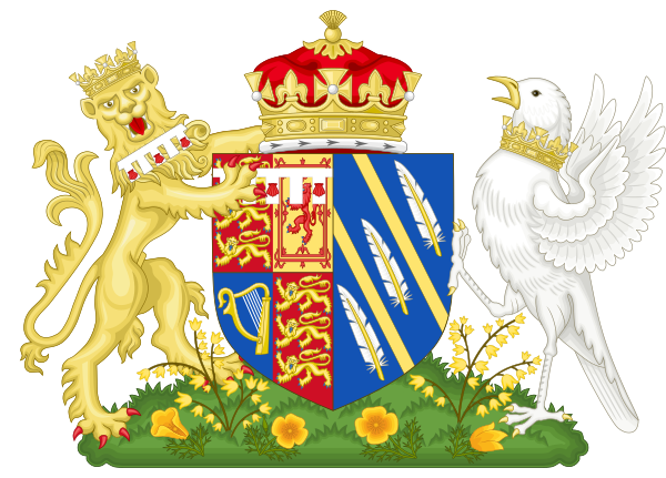 Щит разделён пополам вертикально. Левая половина четверочастно разделена: в первом поле находится герб Англии — в червлёном поле три одинаковых золотых леопарда с лазоревым вооружением, расположенных головами влево, со взглядом, повёрнутым к смотрящему, и с высунутыми синими языками; во втором поле герб Шотландии — в золотом поле с червлёной двойной внутренней каймой, проросшей лилиями, червлёный восстающий лев с лазоревым вооружением;, в третьем поле герб Ирландии — в лазоревом поле золотая арфа с серебряными струнами; четвёртое поле повторяет первое. Поверх левой части щита, частично закрывая первое и второе поля, находится серебряное титло с пятью концами, три из которых обременены тремя червлёными раковинами-гребешками (эскалопом). На правой половине в лазоревом поле изображены две одинаковые узкие золотые перевязи, расположенные диагонально; между ними находятся три одинаковых серебряных птичьих пера с золотым стержнем.