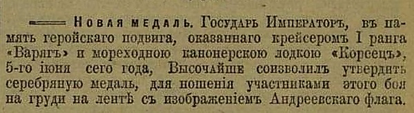 «Государъ Императоръ, въ память геройскаго подвигна, оказанного крейсеромъ I ранга „Варягъ“ и мореходною канонерскою лодкою „Кореецъ“, 5-го іюня сего года, Высочайше соизволилъ утвердить серебряную медаль, для ношения участниками этого боя на груди на лентѣ́ съ изображниемъ Андреевскаго флага».[6]