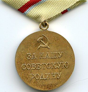 На оборотной стороне медали надпись «ЗА НАШУ СОВЕТСКУЮ РОДИНУ». Над надписью изображение серпа и молота.
