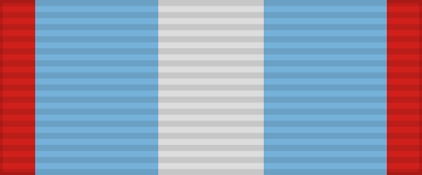 Медаль при помощи ушка и кольца соединяется с пятиугольной колодкой, обтянутой шёлковой муаровой лентой шириной 24 мм. Изначально лента была установлена синего цвета с продольной серебристой полосой посередине шириной 6 мм, и двумя красными полосками шириной по 2 мм по краям. Указом от 19 июня 1943 года была установлена новая лента — оливкового цвета с продольной синей полоской посередине шириной 2 мм[4].