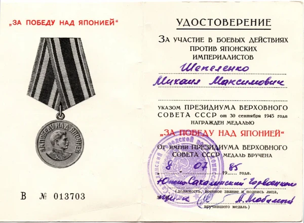 Медаль «За победу над Японией» — награда, которая ознаменовала победу советских войск над Квантунской армией в 1945 году. Указом Президиума Верховного Совета СССР от 30 сентября 1945 года была учреждена медаль за участие в боевых действиях, а 5 февраля 1951 года Постановлением Президиума Верховного Совета СССР в Положение о медали были внесены дополнения.