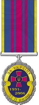 Медаль изготовляется из белого металла и имеет овальную форму, образованную венком из дубовых листьев. В центре медали — изображение прямого равностороннего креста малиновой эмали. Посредине креста — круглый медальон с изображением Государственного Герба Украины на синем эмалевом фоне. Под крестом надпись в две строки: «1991-2006». Медальон обрамлен фигурной лентой желтого металла, на которой в верхней части надпись «За Украину», в нижней — «За её волю». Все изображения и надписи рельефны, пружки креста желтого металла.