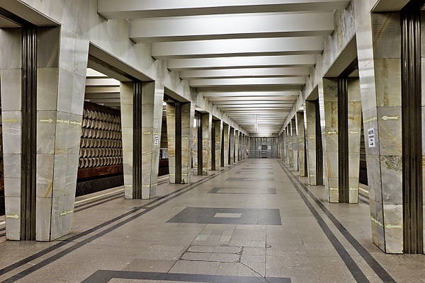 На станции установлены два ряда по 26 колонн (расстояние между колоннами 6,5 метра), которые облицованы желтовато-розоватым мрамором и декорированы вставками из нержавеющей стали. Пол выложен чёрным и серым гранитом, нижняя часть путевых стен — серым гранитом.