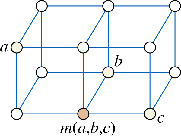 - Коммутативность: m(a,b,c) = m(a, c, b) = m(b, a, c) = m(b, c, a) = m(c, a, b) = m(c, b, a) для всех a, b, и c.
