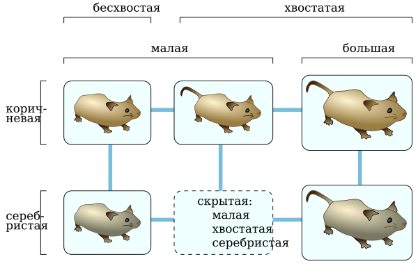 Чтобы сформировать граф Бунемана для множества видов и характеристик, сначала избавляемся от избыточных видов, которые неотличимы от некоторых других видов и от избыточных характеристик, которые всегда совпадают с некоторыми другими характеристиками. Затем образуем скрытую вершину для любой комбинации значений характеристик, таких, что любые два значения существуют в известных видах. В показанном примере есть малые бесхвостые коричневые мыши, малые серебристые бесхвостые мыши, малые коричневые хвостатые мыши, большие хвостатые коричневые мыши и большие серебристые хвостатые мыши. Метод построения графа Бунемана создаст скрытую вершину, соответствующую неизвестному виду малых серебристых хвостатых мышей, поскольку любая попарная комбинация (малая и серебристая, малая и хвостатая и серебристая и хвостатая) появляются в некоторых других видах. Однако метод не предполагает существование больших коричневых бесхвостых мышей, поскольку нет вида больших и, одновременно, бесхвостых мышей. После того, как скрытые вершины определены, образуем рёбра между каждой парой видов или скрытых вершин, которые отличаются одной характеристикой.