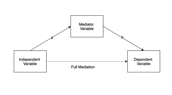 При полной медиации включение переменной медиатора уменьшает отношение между независимой и зависимой переменной ( на диаграмме) до нуля.