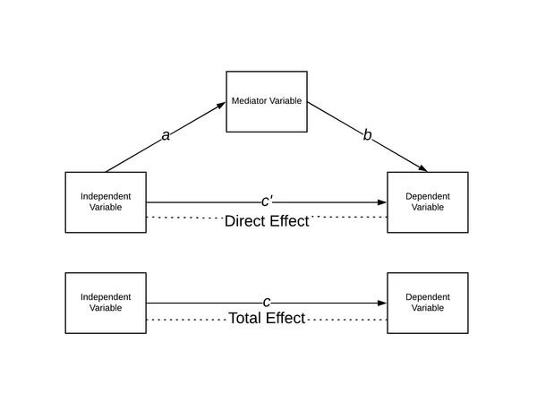 Прямой эффект измеряет степень изменения зависимой переменной, когда независимая переменная увеличивается на единицу, а переменная-медиатор остается неизменной. Напротив, косвенный эффект измеряет степень изменения зависимой переменной, когда независимая переменная остается фиксированной, а переменная-медиатор изменяется на величину, на которую она бы изменилась, если бы независимая переменная увеличилась на одно значение[2]. Косвенный эффект характеризует степень, в которой переменная X влияет на переменную Y через медиатора. На диаграмме косвенный эффект представляет собой произведение коэффициентов и . Прямым эффектом является коэффициент . В линейных системах суммарный эффект равен сумме прямого и косвенного ( на диаграмме). В нелинейных моделях общий эффект обычно не равен сумме прямых и косвенных эффектов, а представляет собой модифицированную комбинацию этих двух эффектов[3].