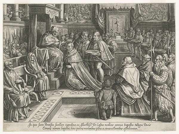 Со смертью Алессандро прервалась линия Медичи, шедшая от Козимо Старшего. Попытки флорентийцев восстановить республику закончились неудачей: Карл V настоял на передаче власти герцога Козимо Медичи, потомку Лоренцо, брата Козимо Старшего[25]. Ловкий политик и тиран по натуре, Козимо I (1537—1574) поставил перед собой задачу образовать из Тосканы одно государство, сосредоточив в своих руках абсолютную монархическую власть. Жестоко преследуя при помощи инквизиции своих противников, используя конфискации и монополии, он собрал значительные средства, на которые создал флот, завоевал Сиену, находил себе союзников во внешней политике. В 1569 году он получил титул великого герцога и был торжественно коронован в Риме папой Пием V[26].