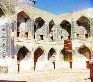 - ↑ Архитектурный приём в средневековом среднеазиатском зодчестве, согласно которому главные порталы двух противолежащих зданий строятся на одной оси, а их главные фасады параллельны друг другу.