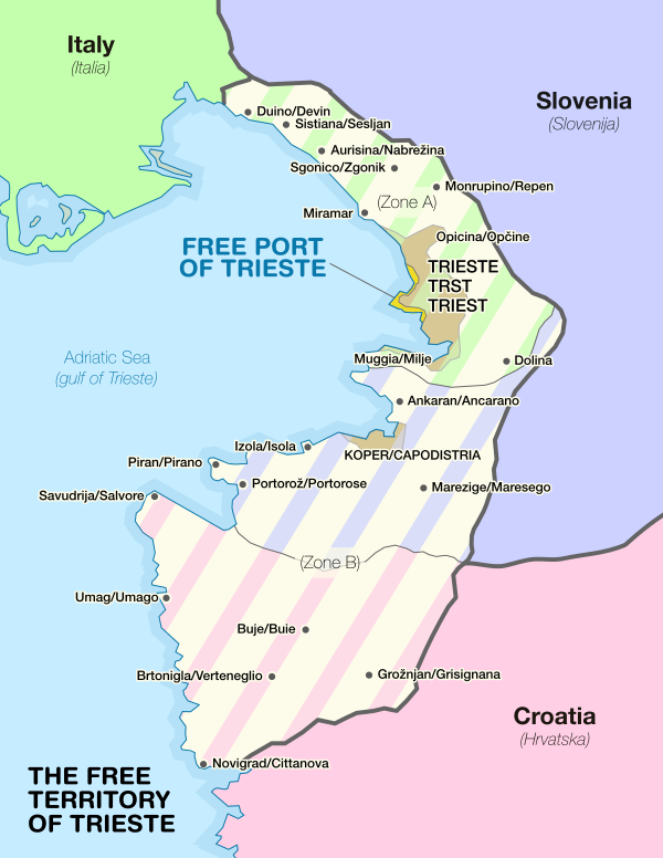 - Свободная территория Триест была международной зоной вокруг порта Триест на Адриатическом море, находящейся под прямой ответственностью СБ ООН. Этот район был создан 10 февраля 1947 года в соответствии с протоколом мирного договора с Италией для размещения этнически и культурно смешанного населения в нейтральной среде, свободной от правления Италии или Югославии, которые предъявляли конкурирующие претензии на территории. Свободная территория была де-факто передана двум ее соседям в 1954 году, и это было оформлено гораздо позже двусторонним договором Озимо 1975 года, ратифицированным в 1977 году[67].