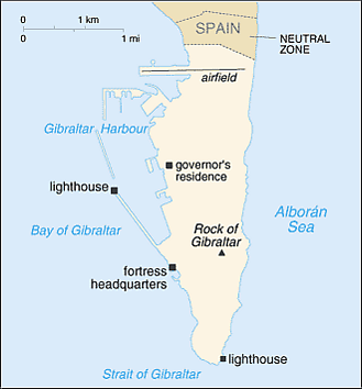 - После окончания осады 1727 года между британской заморской территорией Гибралтар и Испанией была создана нейтральная территория. Полоса земли длиной 600 футов (около 1,2 км), на расстоянии более двух пушечных выстрелов между британскими и испанскими орудиями, называлась «нейтральной территорией» и показывалась как таковая на старых картах. В 1908 году британцы построили забор на участке, который считался британской половиной нейтральной территории. Испания не признаёт британский суверенитет над перешейком (включая границу), утверждая, что это испанская земля. Хотя и Соединённое Королевство, и Испания входили в состав Европейского союза (до выхода Соединённого Королевства), граница де-факто была международной границей с таможенными и иммиграционными проверками; Испания официально не признает её «границей», называя её «забором».