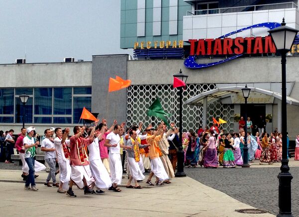 Яркие одеяния шафранового цвета, бритые головы с «шикхой» — небольшой косичкой на затылке, у каждого чётки. Перебирая их, они хором распевают во славу бога Кришны махамантру (молитву) — повторяющиеся в определённом порядке три слова: харе, Кришна, Рама. По сигналу старшего вся эта экзотическая группа преклоняет колени и, к вящему удивлению индийцев, присутствующих в делийском международном аэропорту имени Индиры Ганди, начинает бить поклоны… Так 59 представителей Общества сознания Кришны из Советского Союза прощались с Индией, завершив почти двухмесячное паломничество в эту страну.[62]