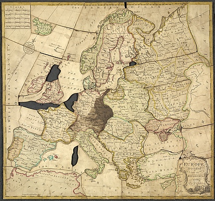 Пазл Спилсбери «Европа, разделённая на королевства и т. д.» (Евразия, Северная и Южная Америка, Африка. Отсутствует Австралия, не до конца изученная к тому моменту, и Антарктида, открытая в XIX веке).