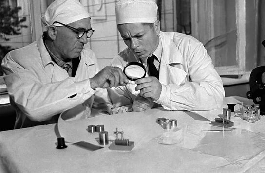 Офтальмолог-микрохирург С. Н. Фёдоров (справа) и слесарь-инструментальщик С. Я. Мильман, изготовивший первые в СССР хрусталики из пластмассы. Фото В. Исаева. Январь 1961 года. Главархив Москвы