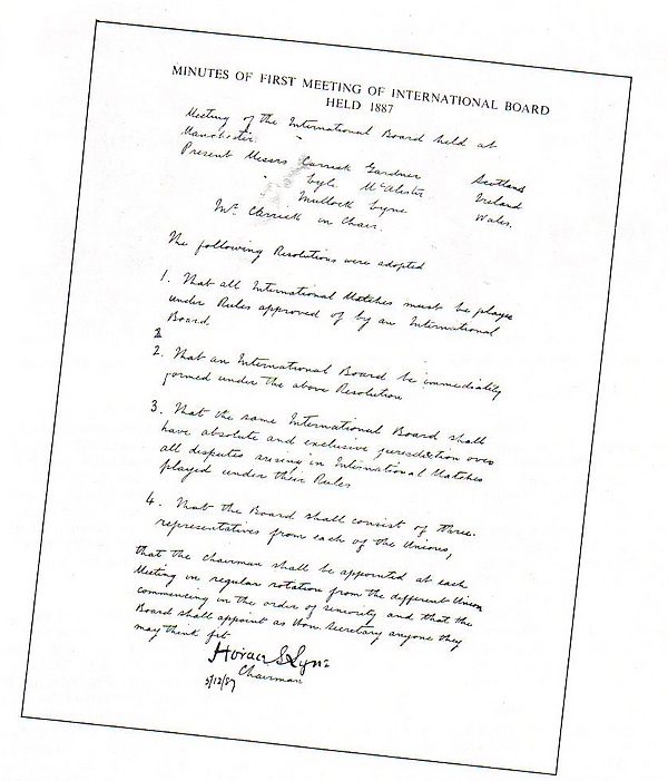 До 1885 года правила регби-15 публиковались в Англии как стране-основательнице вида. Однако спорный эпизод в матче между сборными Англии и Шотландии, проходившем в рамках Кубка домашних наций 1884 года привёл к отказу шотландцев участвовать в следующем розыгрыше Кубка[1]. В результате регбийные союзы Ирландии, Уэльса и Шотландии пришли к соглашению о формировании международного органа, которым будут утверждаться единые правила игры. Первая встреча сторон прошла в Дублине в 1886 году, однако решение по формальным правилам не было достигнуто. Следующее заседание прошло в Манчестере в декабре 1887 года, где были подписаны четыре первых нормы нового совета. Английские чиновники отказались принимать участие в договоре, так как их не удовлетворила предлагаемая советом степень их участия в принятии решений[8]. Кроме того, Английский регбийный союз отказался признавать совет в качестве конституирующего органа[8]. Это привело к запрету на участие в международных играх с Англией. Таким образом, члены совета не встречались с английскими сборными в 1888 и 1889 годах[9] В 1890 году Англия присоединилась к совету, получив шесть голосов, в то время как остальные участники обладали всего двумя[9]. В том же году советом были опубликованы первые международные правила регби-15[10].