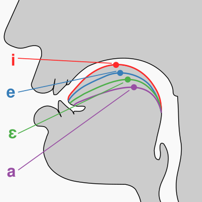 Гласный определяется в МФА как звук, находящийся в центре слога[31]. Ниже приведена таблица гласных МФА. Гласные в МФА располагаются соответственно положению языка при произношении.