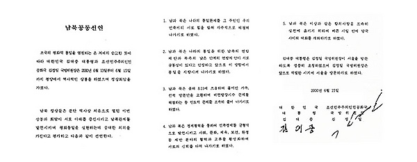 Межкорейский саммит 2000 года был первой встречей лидеров РК и КНДР после разделения страны в 1945 году. Совместная декларация РК и КНДР от 15 июня, ставшая итогом проведения первого межкорейского саммита, послужила ориентиром для перехода от конфронтации Юга и Севера в условиях холодной войны к сосуществованию[3].