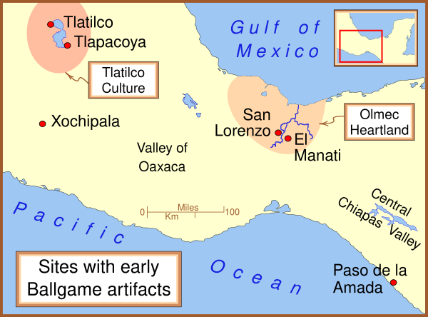 Из тропических низменностей игра, очевидно, распространилась в центральную Мексику. Начиная с 1000 года до н. э. статуэтки игроков клались в захоронения в Татилько и около поселения Тлапакоя. Однако найти стадионы для игры в мяч в этих местах не удалось.