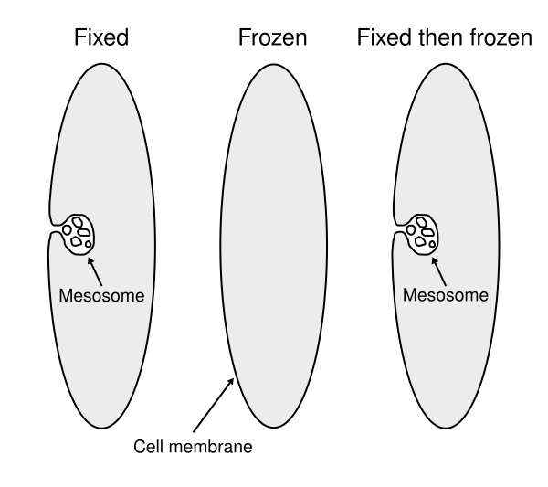К концу 1970-х годов накопились данные, свидетельствующие, что мезосомы — это артефакты химической фиксации при подготовке препарата к электронной микроскопии и не встречаются в клетках, которые не подвергались химической фиксации[1][7]. Когда к концу 1980-х годов получила распространение криофиксация при подготовке препаратов для электронной микроскопии, мнение о том, что мезосомы — артефакты пробоподготовки и не существуют в живых клетках, широко распространилось[8][9]. Однако ряд учёных до сих пор утверждает, что мезосомы не во всех случаях являются артефактами[10][4].