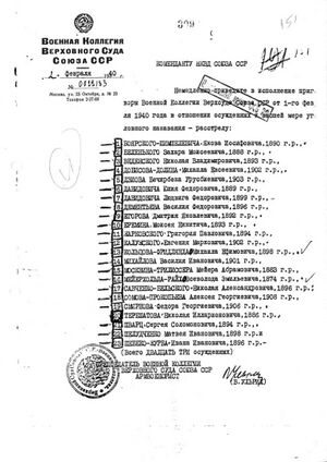 В 1987 году ей стало известно и подлинное место захоронения Мейерхольда: „Общая могила № 1. Захоронение невостребованных прахов с 1930—1942“ на кладбище московского крематория у Донского монастыря. По решению Политбюро от 17 января 1940 года № II 11/208, подписанному лично Сталиным, тогда расстреляли 346 человек. Их тела кремировали, и прах, ссыпанный в общую могилу, смешан с прахом других убитых»[27].
