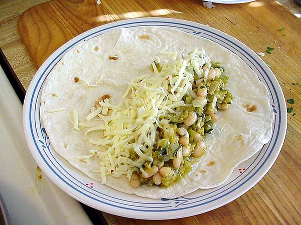 Основу составляют тортильи (исп. tortillas) — кукурузный лаваш[1] с приправами, среди которых первое место занимает перец чили («визитная карточка» мексиканской кухни[1]) и сальса. Из торти́лий изготовляют различные рулетики: буррито (мясной пирог), энчилада (большой политый сырным соусом конверт из мягкой лепёшки, внутри — курица, мясо, фасоль), и чимичанги (обжаренные в кипящем масле трубочки с сыром, мясом курицы или говядины и помидорами). На них также выпекают яичницу уэ́вос. Они подаются к салатам из фруктов и овощей, самым характерным из них является гуакамо́ле (пастообразный соус из авокадо с добавлением помидоров, лука и перца серрано) и пико-де-гайо (клюв петушка) — острый соус из нарезанных кубиками помидоров, лука и перцев халапеньо.