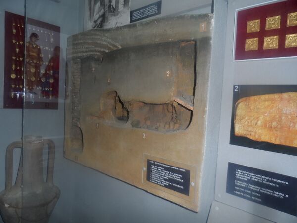 | Артефакты | 4000 золотых украшений (налобный венок, подвески, сережки, кольца, бусинки, пуговицы), горит, 50 золотых блях, боевой пояс |